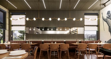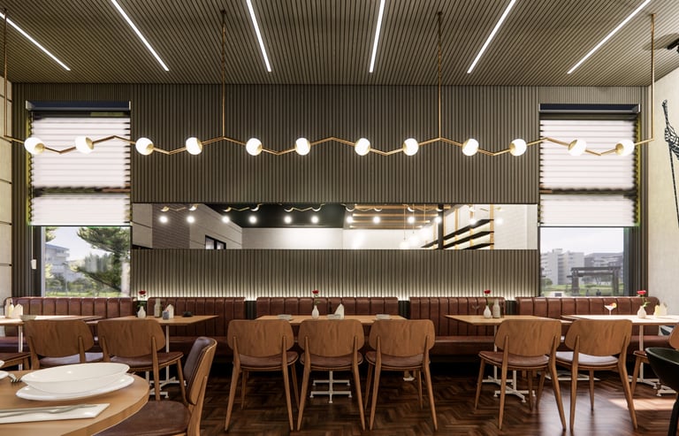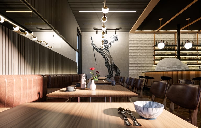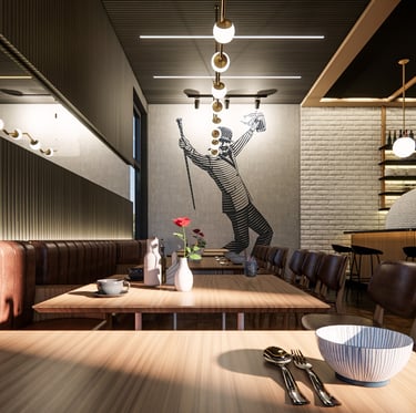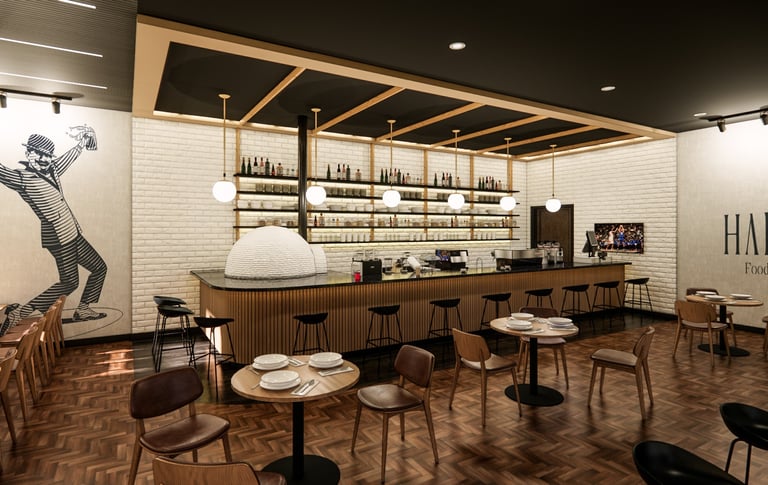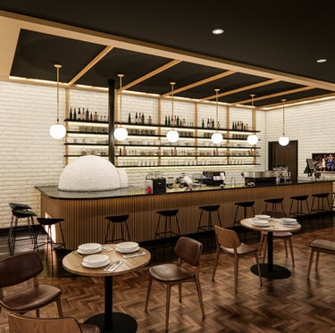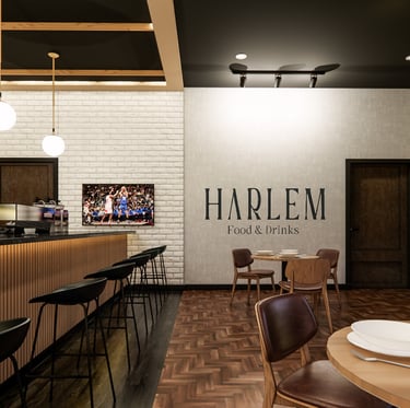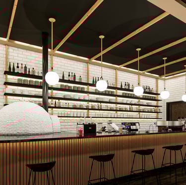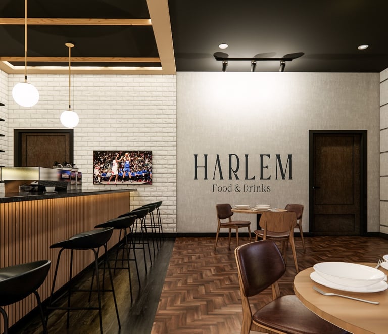 The Eatery is designed to create a unique experience where simplicity meets elegance. Our proposed design reimagines the traditional pizzeria with a warm and moody ambiance enhanced by contemporary lighting and rich textures. In our design, The juxtaposition of white brick against rich, dark wood flooring creates a striking contrast, making the bar area an enticing focal point. Comfortable seating arrangements invite you to relax, fostering a sense of togetherness. Harlem welcomes you, whether it's a quick lunch or a leisurely dinner.